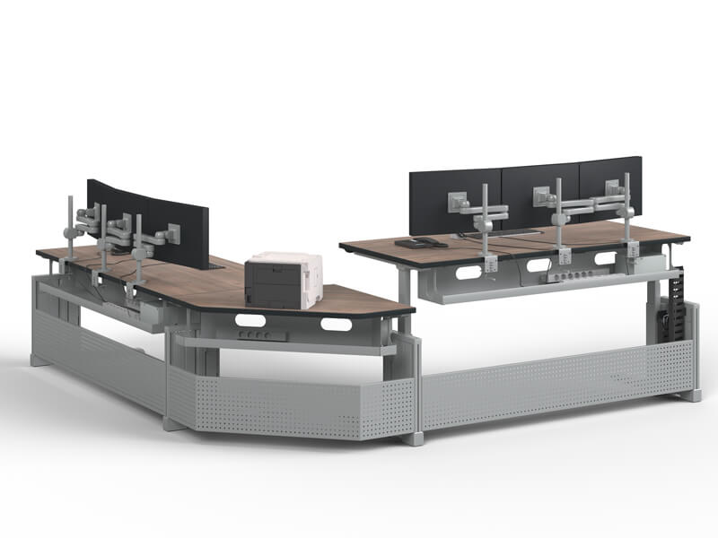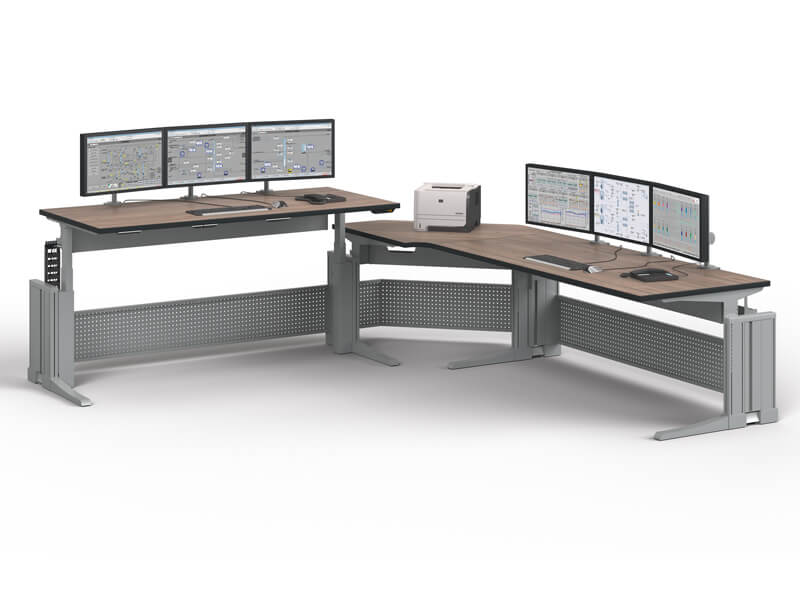 Knürr Elicon® VC/VC-E - Höheneinstellbare und elektrisch höhenverstellbare Konsolen für beste Ergonomie und Bedienereffizienz. Der modulare Aufbau ermöglicht eine Vielzahl von Konfigurationen und sorgt für ein Höchstmaß an Flexibilität. Konsolenelemente können jederzeit nach- und aufgerüstet werden, für optimale Zukunftssicherheit. Hochwertige Materialien wie Aluminium-Druckgussprofile garantieren höchste Stabilität und Langlebigkeit.