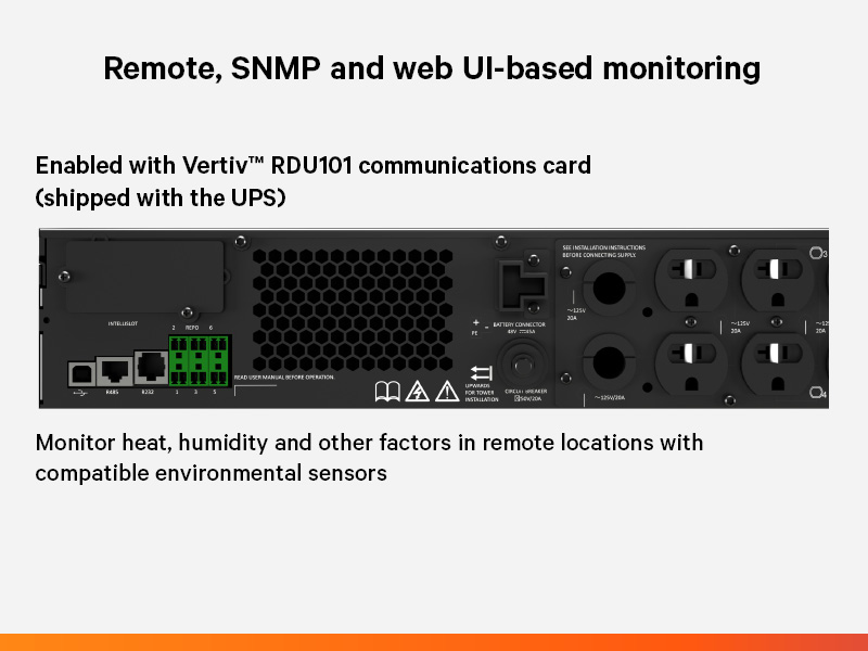 - SNMP and web management enabled with optional Vertiv RDU101 communications card; serial connection for out-of-band management