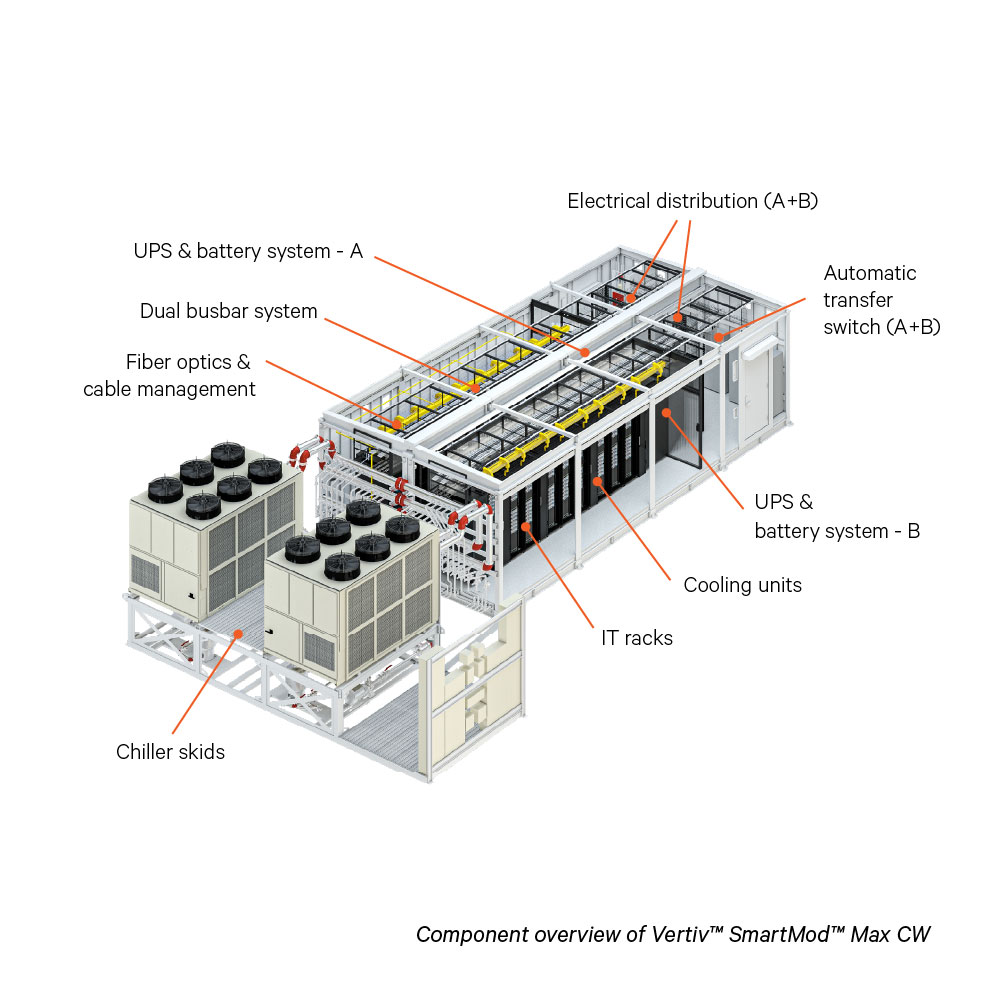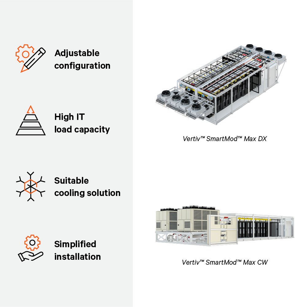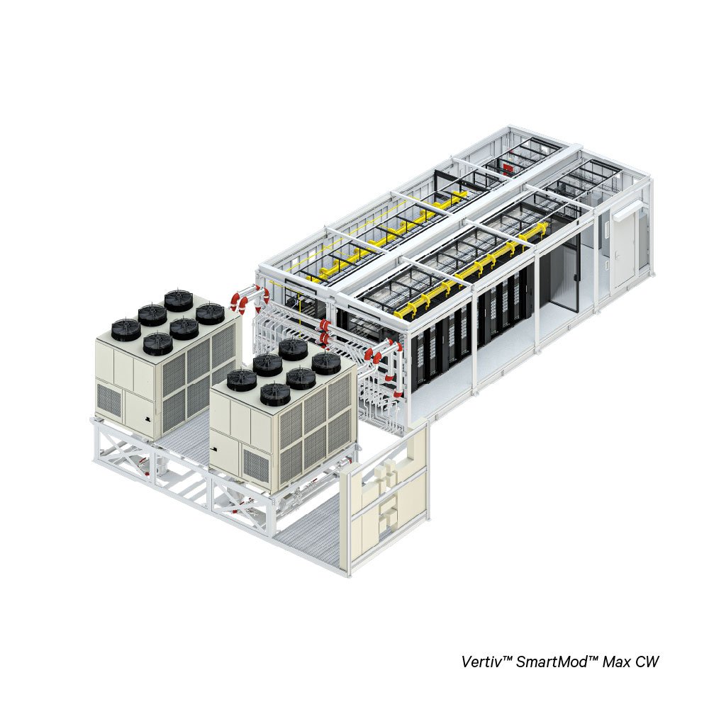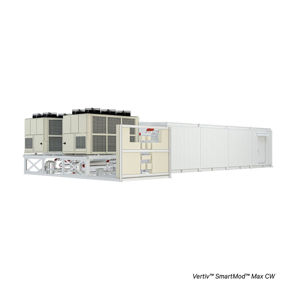 - REDUCED ENVIRONMENTAL IMPACT: The Vertiv™ SmartMod™ Max CW variant uses chilled water cooling, helping reduce direct environmental impacts in data center applications.