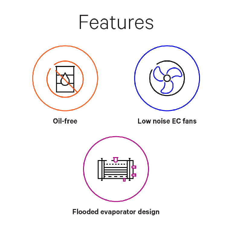 • ENHANCED ENERGY EFFICIENCY: Equipped with an oil-free, zero-friction compressor, flooded evaporator, low-noise EC fan, and more, the system achieves integrated part load performance that meets and exceeds key energy efficiency standards. In high-temperature conditions, an optional humidification system helps lower condensing temperatures. ​