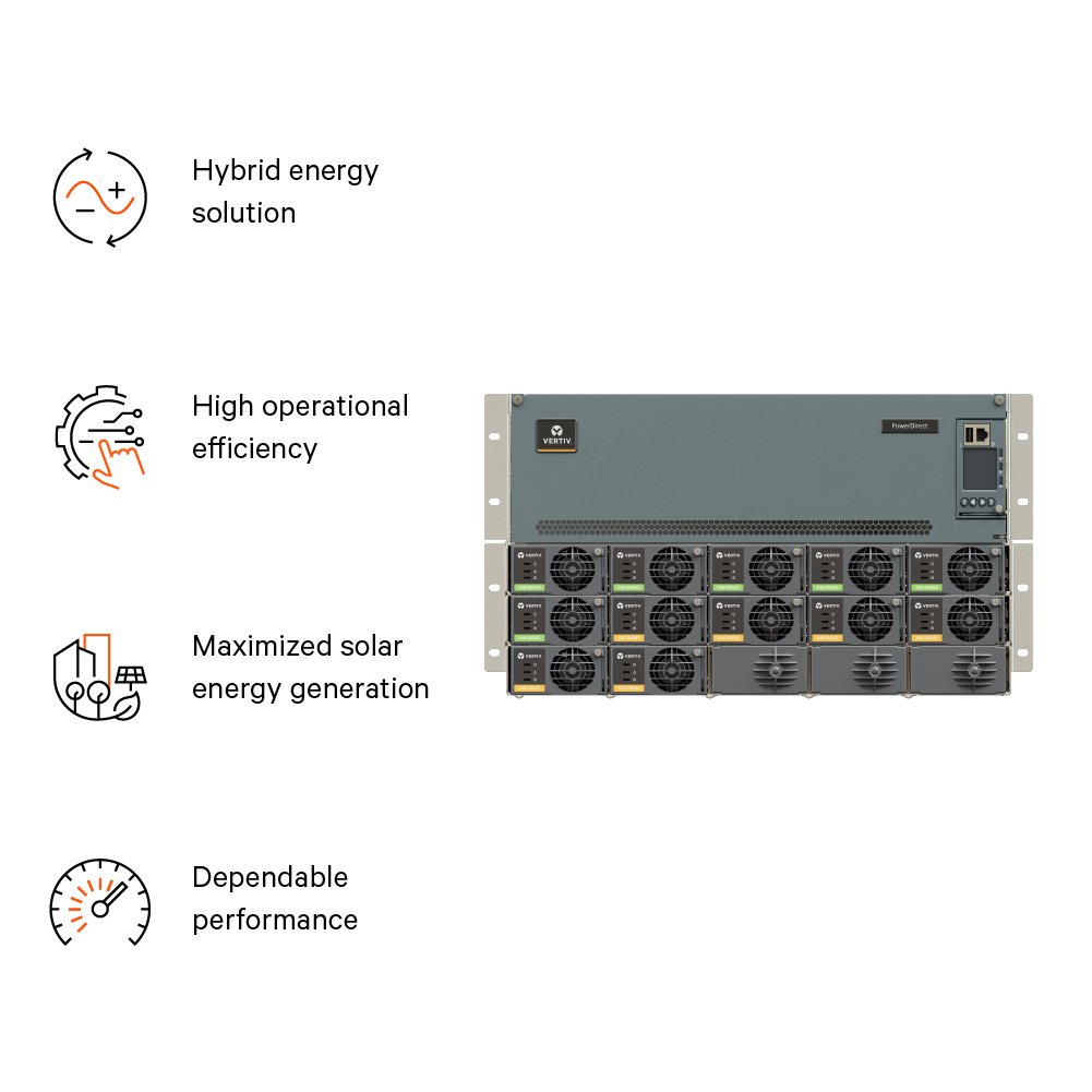 • REDUCED ENERGY COSTS: It uses Vertiv’s high efficiency rectifiers and solar converters to lower energy losses and operational expenses.