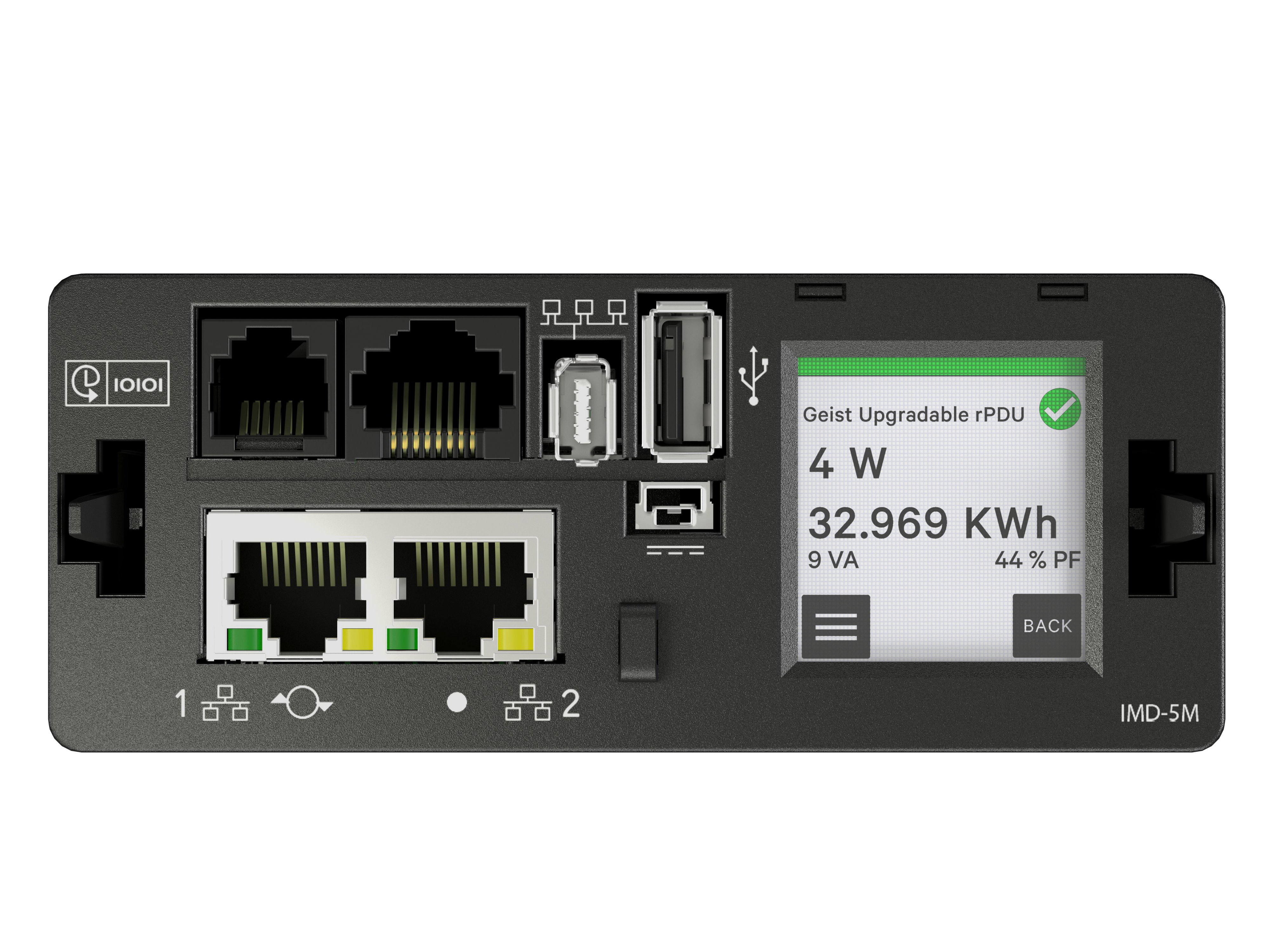 • The universal power input can mate to any geographically specific Facility Side Cable and is designed to operate with variable power input configurations (defined by the connected cable). • The Pivoting Connector adjusts from 0 to 90 degrees to assist with power cable routing. • Global compliance certification includes: UL Certified, CE Marked, China RoHS, RoHS Compliant, and RCM Mark (EMC only). • High Temperature Grade 60°C for high temperature environments. • Available in vertical and horizontal rackmount form factors. • Simple and quick installation in all standard racks or cabinets with included mounting brackets. • Simple and convenient configuration options for chassis colors. • TAA compliant. • The LCD touchscreen of the IMD-5M auto-orients for both vertical and horizontal units. • Enhanced with Secure Boot, the Hardware key and Firmware key must match to boot up. • When connected with another rPDU via a redundant power cable, the IMD-5M remains powered when the rPDU loses power.
