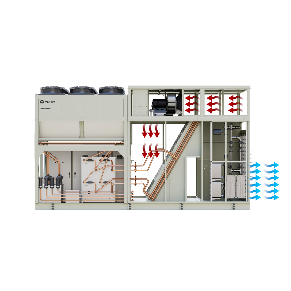 The Vertiv™ CoolPhase Flex is the industry’s first packaged system offering liquid and air cooling for modern data centers. It provides flexibility to be initially deployed as an air-cooling solution, functioning as a legacy Vertiv™ Liebert® DSE packaged unit, or as a liquid cooling solution for AI and high-density computing applications. Additionally, it allows subsequent field conversion between air and liquid cooling, enabling you to address immediate needs while positioning your business for future growth with minimal operational disruptions.