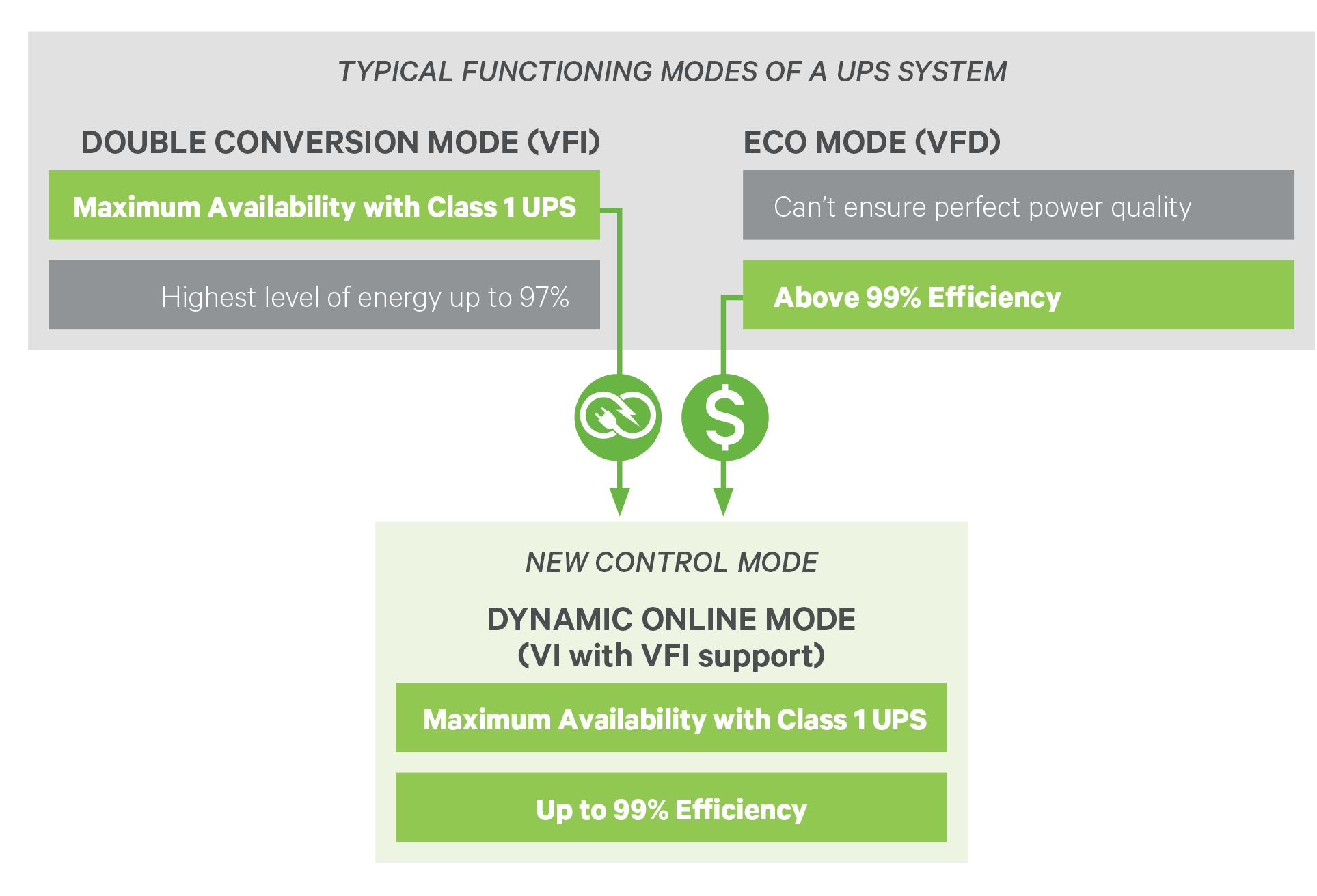- 3 MODES OF OPPERATING EFFICIENCY: Double Conversion (97%), Dynamic Online (99%) and ECO Mode (>99%)