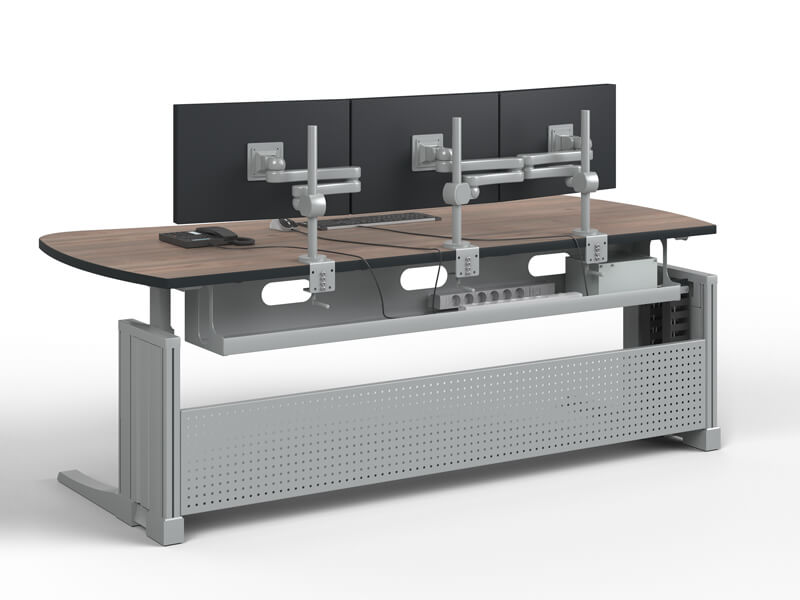 KNÜRR ELICON® VC/VC-E - THE VERSATILE CONSOLE FOR A WIDE RANGE OF APPLICATIONS: Whether for video surveillance, security dispatching or engineering workstations – our comprehensive product range offers optimal solutions for a customized, ergonomic and efficient workstation. The modular design enables a wide variety of configurations and guarantees the highest degrees of flexibility. Combinations of tables can be retrofitted or modified at any time and without considerable effort. High quality materials with extruded aluminum profiles in combination with die-cast aluminum stabilizers ensure a maximum degree of stability and sturdiness. Ergonomic details simplify daily work in various situations and environments. A comprehensive range of accessories completes the Knürr Elicon workstation system: flat screen holders, PC and 19-inch rack containers, workstation lighting, usable storage trays, cable routing ducts and other extras.