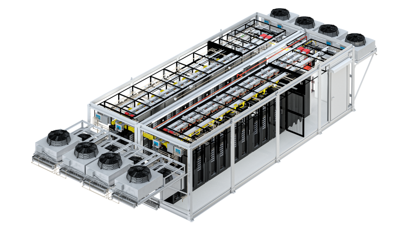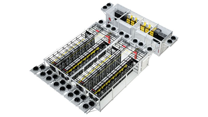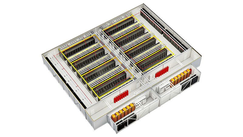 Vertiv™ MegaMod™ is a complete flexible, scalable data center solution starting from 0.5MW and easily expandable in units of 0.5 MW or 1 MW. The basic building block can further be multiplied in any of the three directions to create larger data centers. MegaMod™ provides everything you need to get started with a fully equipped modular data center, from external power rooms, to cooling, racks, monitoring and fire protection.