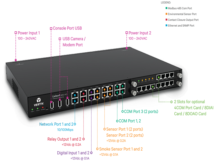 The Liebert® RDU-A G2 is an infrastructure management solution from Vertiv that allows data center administrators to manage environmental conditions i.e. temperature and humidity, leak, smoke, vibrations and digital inputs and outputs.