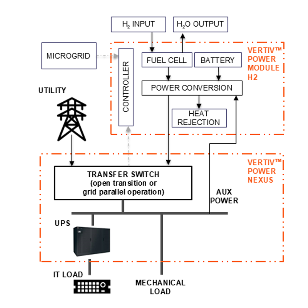 Vertiv™ Power Module H2 is a prefabricated backup power solution based on Proton Exchange Membrane (PEM) hydrogen fuel cell (FC) technology. Power Module H2 provides reliable, zero-emission backup as an alternative to diesel generator, enabling deployment of datacenter capacity in regions with environmental and power grid capacity constraints. By integrating PEM FCs with power converters, bridging batteries, heat rejection, master controller into a single product, Power Module H2 reduces complexity for end user.