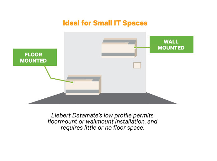 Vertiv™ Liebert® DataMate Mission Critical Cooling System, 5-10.5kW is a small footprint cooling system for 7x24 temperature and humidity control in network closets, computer rooms and other small spaces. Its low profile permits floor-mount or wall-mount installation, and requires little or no floor space.