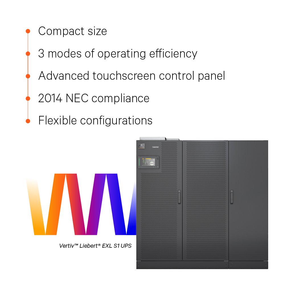 The Vertiv™ Liebert® EXL S1 UPS, with capacity of 250-1200kW, is optimized for maximum efficiency and power density. It has a small footprint, lower than similar UPS in its class or in its kVA size range. It is ideal for customers who need every square foot to offer a positive ROI, such as colocation providers, hosting and cloud businesses. This UPS allows customers to either redeploy the saved space to implement more revenue generating IT equipment or reduce the actual design size of their equipment rooms, thus saving construction costs. At Dynamic Online mode, the UPS can have operating efficiency of up to 99% without sacrificing availability. Its touchscreen control panel provides status-at-a-glance convenience, flexible views and multiple security options. With Vertiv™ LIFE™ Services, get 24x7 remote monitoring by our expert staff to improve availability and lower labor costs.