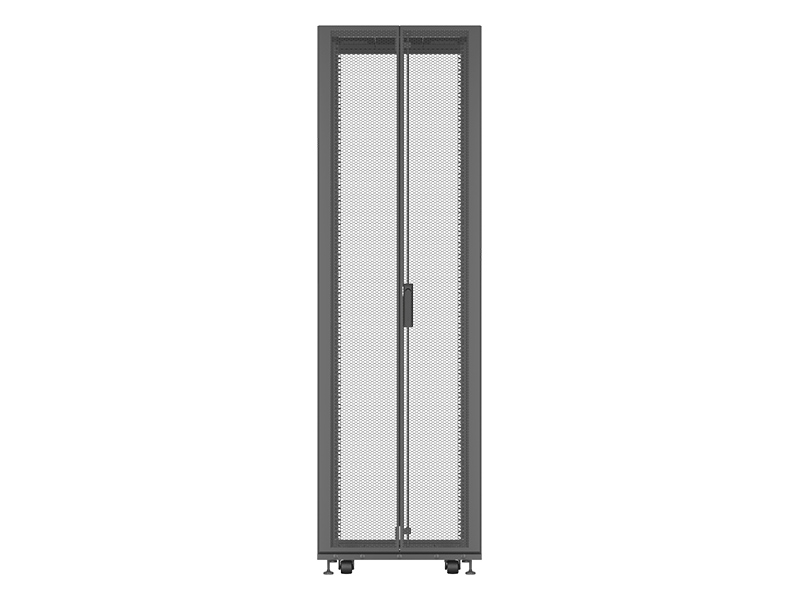 • Available in 8 standard sizes • Full depth adjustability of the 19” rails • Doors that have 77% perforation and can be hinged on either side • Two dual purpose full height depth adjustable PDU / cable management brackets mounted in the zero U space with tool-less button mounting of rack • 42U frame height that allows for the rack to pass through standard doors on casters • Simple external baying, allows for metric baying or on 24” center • Split side panels with single locking slam latch allows for simple removal / installation