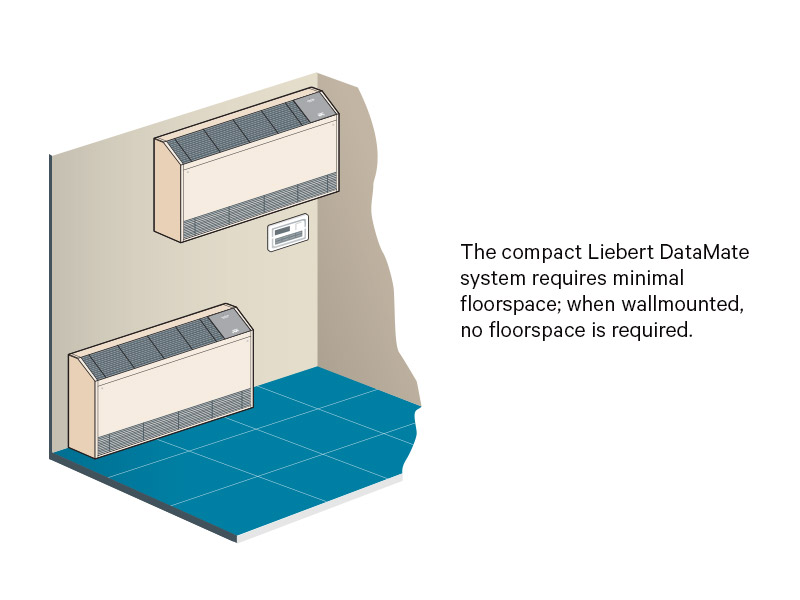 The Liebert DataMate is a split-system evaporator available in combination with a remote air-, water- or glycol-cooled condensing unit or a close-coupled water/glycol-cooled condensing unit, or as a self-contained, chilled water unit. Models are available to fit small computer rooms, requiring only five quare feet or less of floor space, or can be mounted on a wall. Each split system has thermostat-type wiring to controls and condensing unit. System components are pre-charged with refrigerant using quick-connect fittings for fast installation. The unit is designed for front service access.
