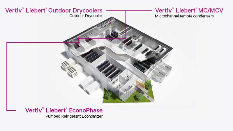 Direct expansion systems take advantage of condensers or drycoolers located outside to reject the heat that is captured in the data center. Depending on the air-cooled product, Vertiv offers a wide range of heat rejection options to manage the heat produced by the IT equipment effectively.