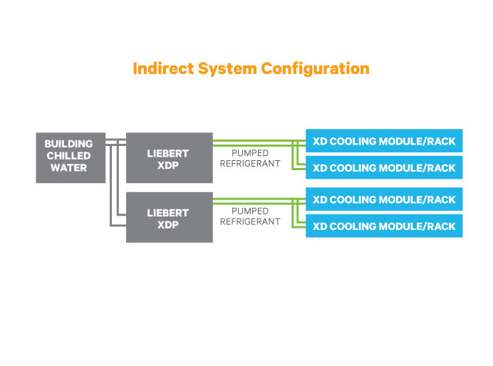 Las unidades de bombeo y enfriamiento para interiores Liebert XD incluyen las unidades Liebert XDP y Liebert XDC. Los sistemas Liebert XD con refrigerante trabajan con módulos de aire acondicionado para centros de datos por áreas/zonas, los cuales incluyen las unidades de Liebert XDO, Liebert XDV, Liebert XDH y Liebert XD CoolFrame El Liebert XDP se utiliza entre las unidades de enfriamiento y un sistema de rechazo de calor asociado, mientras que el Liebert XDC se utiliza entre las unidades
