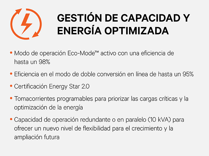 El Liebert™ GXT5 es una solución de UPS de doble conversión en línea que ofrece una protección superior contra cortes eléctricos y un acondicionamiento continuo de la energía en un sistema compacto y de implementación flexible. Protege los equipos críticos contra prácticamente cualquier alteración en el suministro como resultado de cortes eléctricos, caídas de tensión, sobretensiones o interferencias por ruido. Los tiempos de operación escalables con los gabinetes externos de baterías con detección automática ofrecen una flexibilidad adicional cuando se requiere un suministro ininterrumpido prolongado. La pantalla LCD con interfaz intuitiva y la capacidad total de gestión de la red, con configuración y actualizaciones remotas, hace que este sistema sea fácil de implementar y mantener. El Liebert™ GXT5 satisfará sus necesidades de aplicaciones críticas gracias a su eficiencia líder en el mercado y a la operación del factor de potencia unitario.