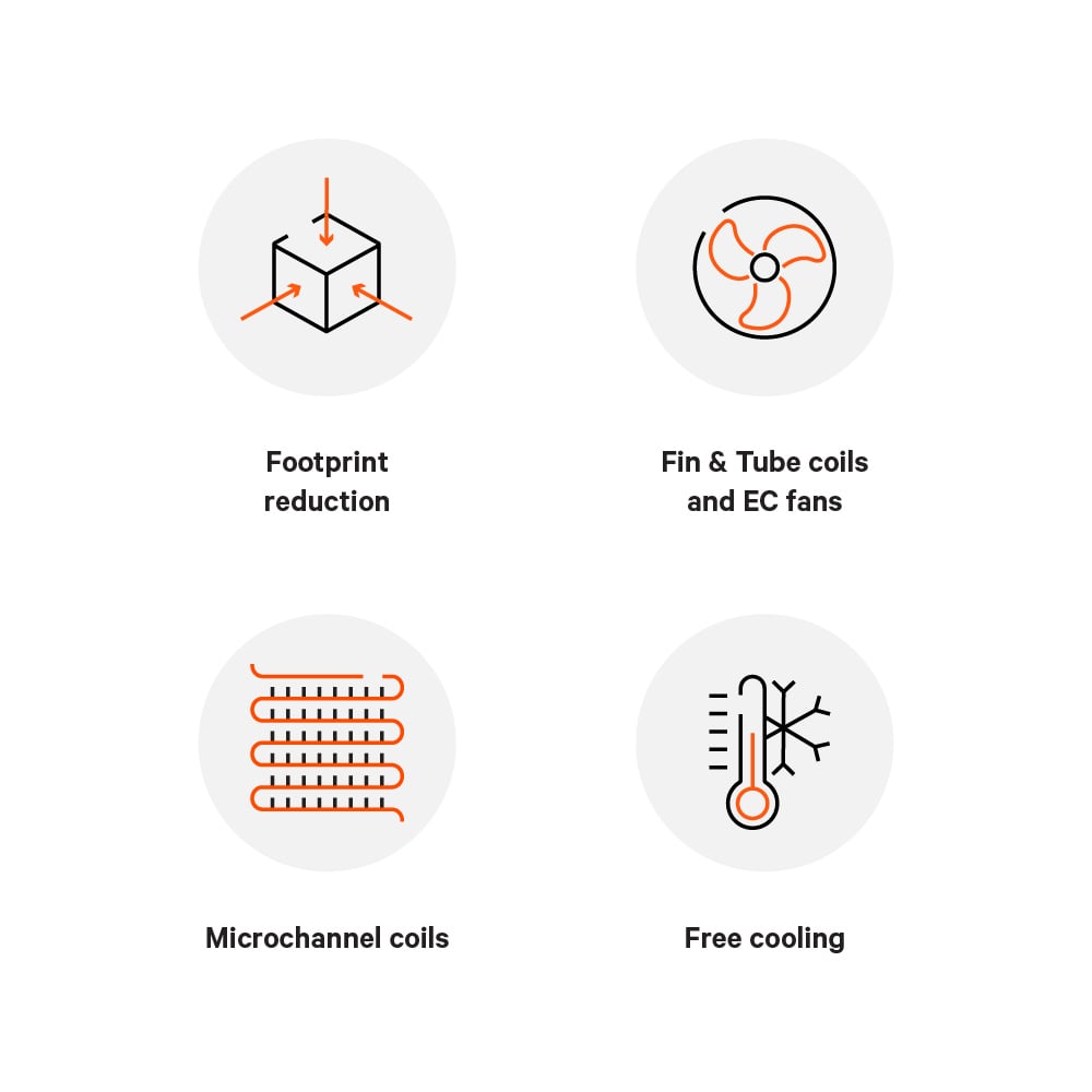 - FLESSIBILITÀ UNICA: I condensatori Vertiv™ CoolPhase, modelli OAC e OAV, sono compatibili con la gamma Vertiv™ CoolPhase Perimeter PAM, offrendo maggiore flessibilità e integrazione.