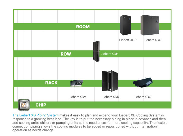 Liebert XD refrigerant-based cooling modules deliver high-density cooling with highly flexible configurations for floor-mount, rack-mount and ceiling-mount applications.