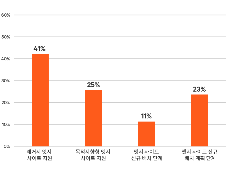 유럽, 중동 및 아프리카와 인도의 응답자들은 레거시 엣지 사이트를 지원하고 있을 가능성이 가장 높았으며, 레거시 사이트가 이 두 지역 내 엣지 활동의 약 절반(각각 49%와 50%)을 차지하고 있었습니다. 다른 모든 지역의 경우, 응답자의 37%가 레거시 엣지 사이트를 지원하고 있었습니다.