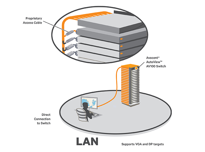 Avocent AV100 KVM basic switch offers simplified local access, management and control of up to 16 targets from a single console. This single user, smaller form factor KVM switch is designed specifically for IT rooms, small Data Centers and Branch Offices.