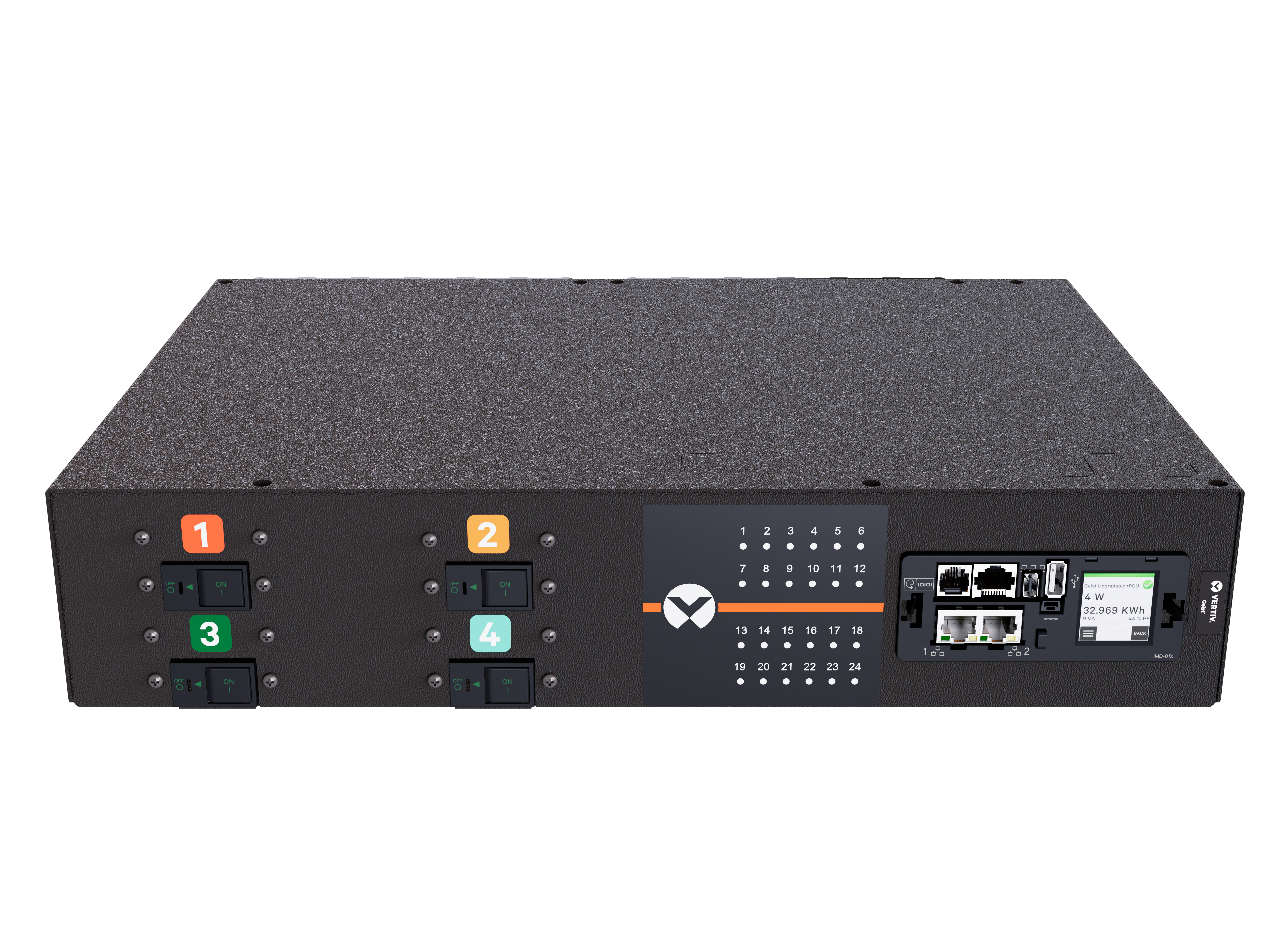 The Vertiv PowerIT Monitored Outlet Level rPDU VP6U62A0 is an upgradeable, 60/63A, 240V, 2U, horizontal rPDU with input and outlet level monitoring, 24 Combination C13/C19 outlets, and a 1P+N+E (IP44) plug providing 14.4kW power capacity. It has a hot-swappable Interchangeable Monitoring Device (IMD-5M), as well as dual gigabit ethernet ports to simplify multiple-PDU management.
