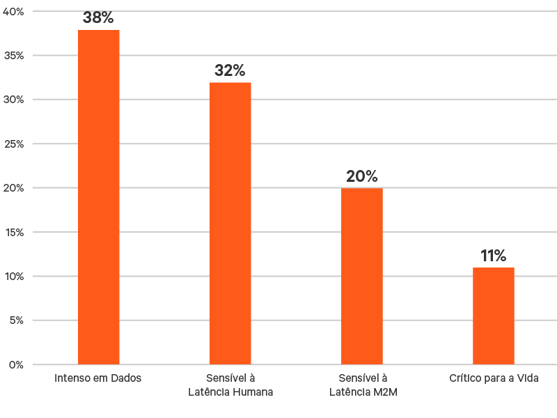- Sensíveis à Latência Máquina a Máquina são casos de uso que normalmente necessitam uma latência ainda menor do que os casos de uso Sensíveis à Latência Humana devido à velocidade pela qual as máquinas podem processar dados. Os principais casos de uso dessa categoria incluem a rede elétrica inteligente e os sistemas de segurança inteligentes. Um quinto dos participantes (20%) disseram que seus investimos em tecnologia para o edge são motivados por casos de uso Sensíveis à Latência Máquina a Máquina.