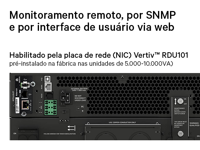 A completa variedade dos sistemas UPS Vertiv™ Liebert® GXT5 monofásicos é fácil de implementar com um design conversível de rack/torre que proporciona flexibilidade de instalação. Seu LCD colorido com sensor de gravidade proporciona uma interface amigável para configuração e gerenciamento locais. O setup e as configurações também são fáceis com a detecção automática de gabinetes externos de baterias compatíveis, proporcionando soluções de autonomia adicional. Com uma placa de rede (NIC) disponível, a suíte Vertiv de soluções de gerenciamento, incluindo o Vertiv™ Power Insight e serviços Vertiv™ LIFE™ Services, está disponível para dar suporte à sua infraestrutura crítica. Projetado para ter alta disponibilidade e capacidade, esses modelos de UPS com altos fatores de potência de saída - até a unidade - proporcionam mais potência útil para os equipamentos conectados. A operação com alta eficiência desse UPS certificado como Energy Star® 2.0 significa que você tem proteção ao mesmo tempo em que suporta a sustentabilidade. Uma maior eficiência é também alcançada com o modo de operação ECO Ativo.