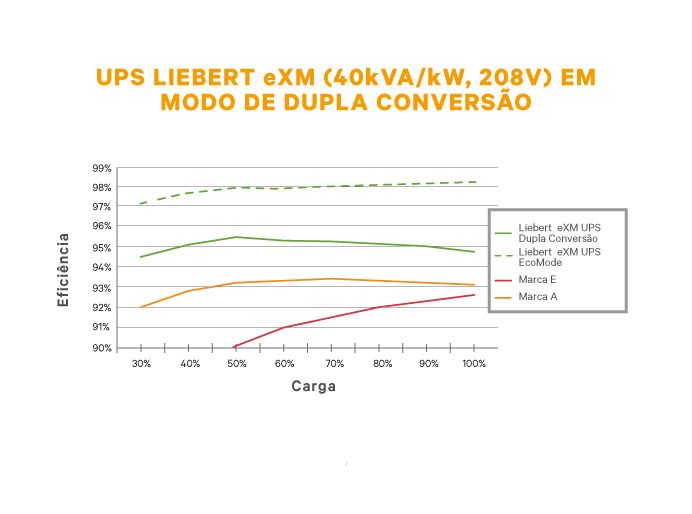 O UPS Trifásico Liebert EXM, está disponível em opções de escalabilidade de potência ou capacidades fixas de10kVA/kW a 250kVA/kW. Através de seu design modular o Liebert EXM dispõe de módulos de 20kW para operar de 10 a 200kVA/kW em 208V ou 50kW para operar de 50 a 250kVA/kW, quando alimentado em 480V. O certificado ENERGY STAR® garante a mais alta eficiência do mercado de médio porte, sua eficiência de 96% pode ser aprimorada para 99%, operando em Eco Mode. O Liebert EXM é um produto integrado que traz maior capacidade em menor espaço físico.
