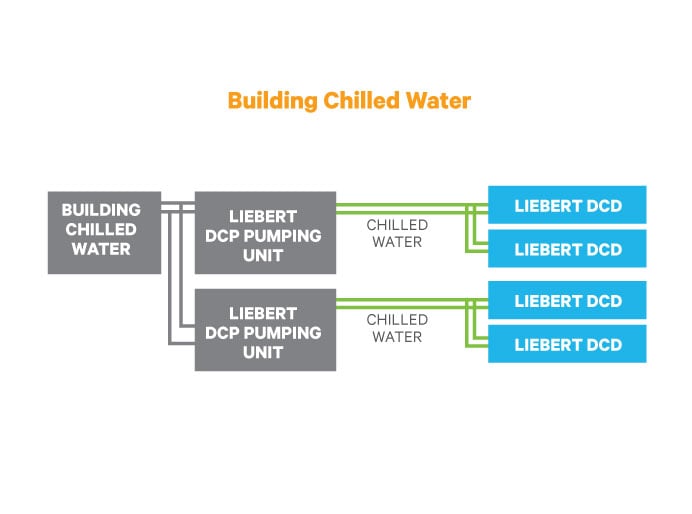 The Liebert DCD is a fanless heat exchanger module that installs as the rear door of an equipment rack. This chilled water-based system provides up to 50kW of room-neutral cooling. As many as ten Liebert DCD modules are connected to a single Liebert DCP coolant pumping unit, which acts as an isolating heat exchanger between the building chilled water source and the circulating cooling water.